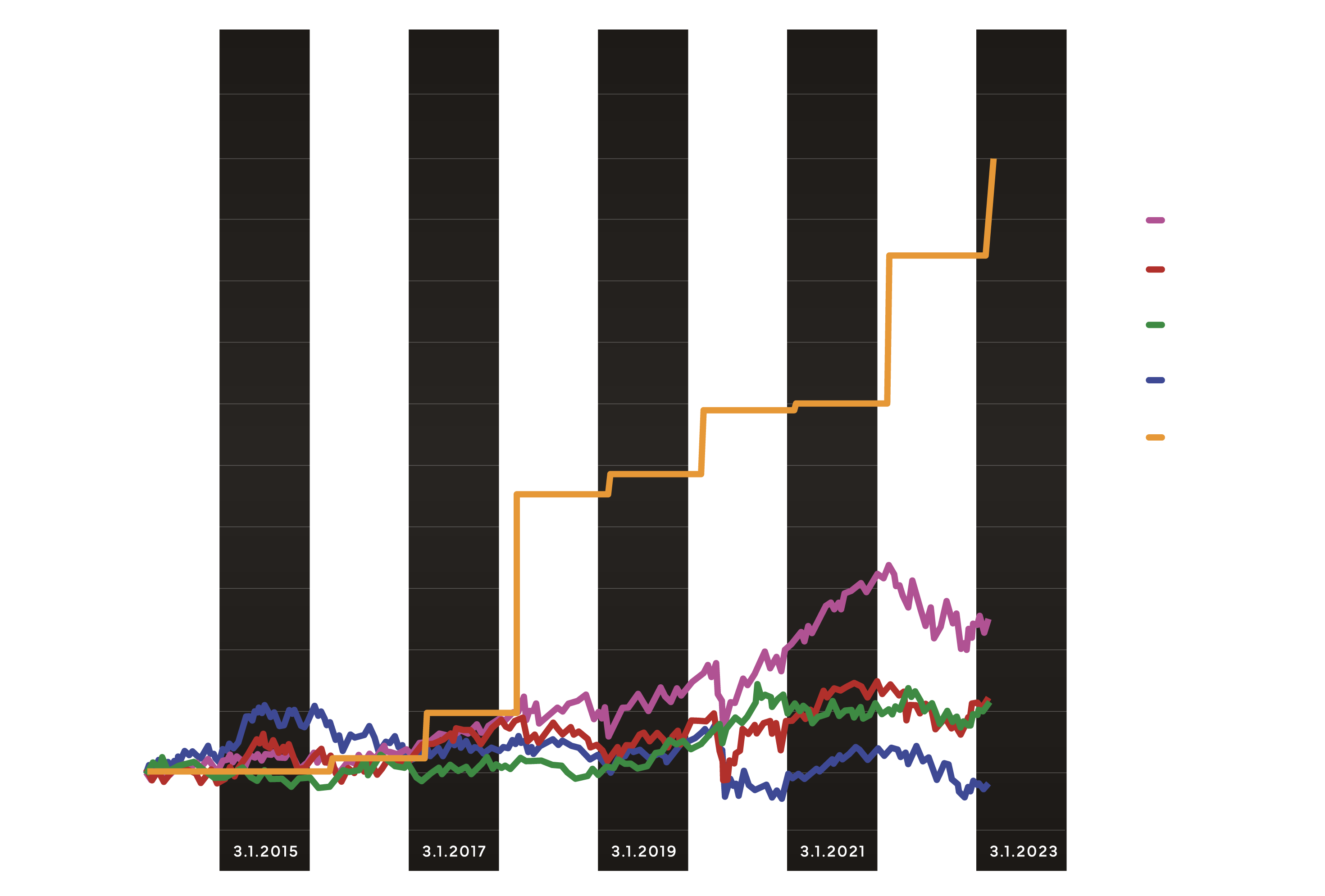 Zdroj: Vlastné spracovanie, údaje pre indexy: Bloomberg, zdroj údajov pre ČSSR dukáty: Katalog mincí a medailí ČSR, ČR a SR (ročníky 2014 – 2022).